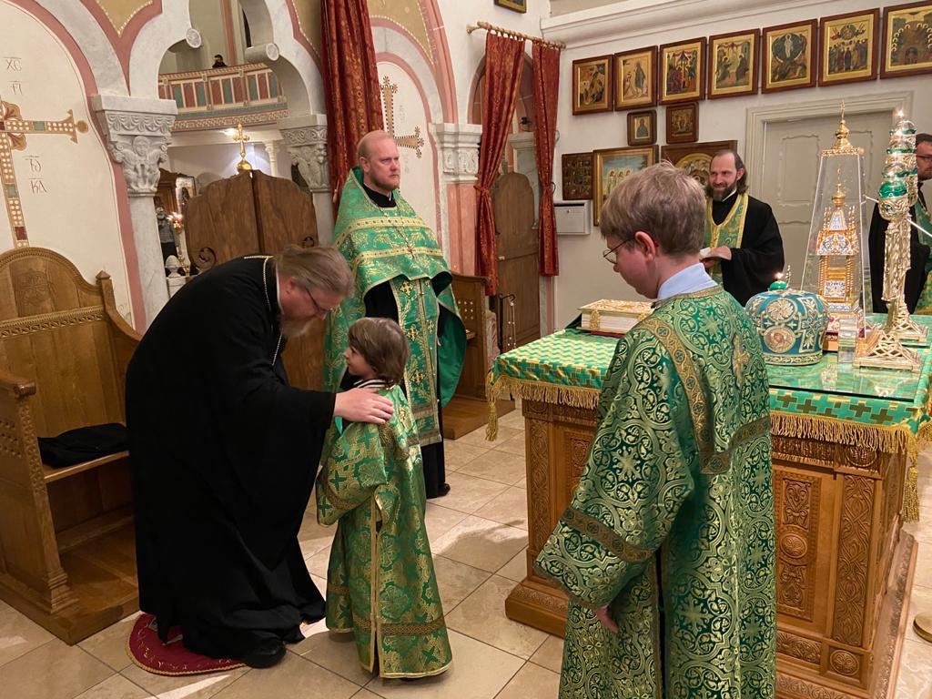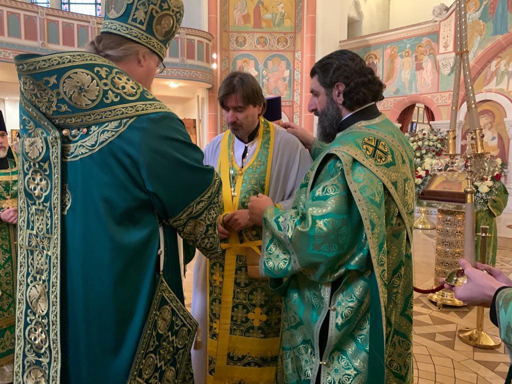 На малом входе за усердные труды во славу Святой Церкви протоиерей Александр Берташ, настоятель храма святых царственных страстотерпцев г. Бремена и иерей Геннадий Сар, настоятель прихода Воскресения Христова г. Люнебурга были удостоены патриаршей богослужебно-иерархической награды — права ношения палицы.