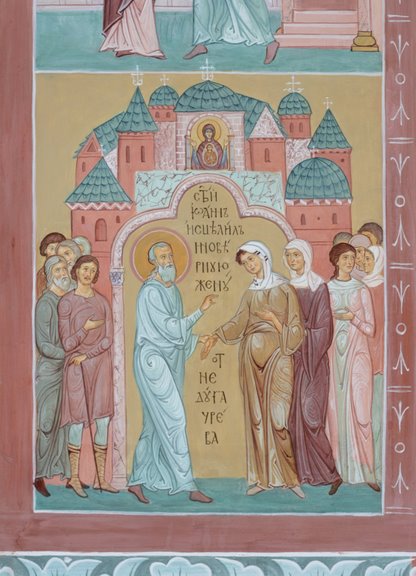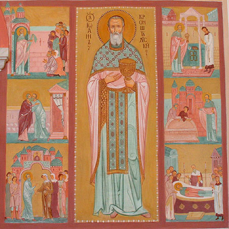 Отец Сергий рассказал о фреске св. Иоанна Кронштадтского на иконостасе храма и тех событиях, из жизни Кронштадтского пастыря, которые отражены в житийных клеймах этого изображения.