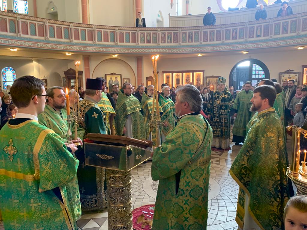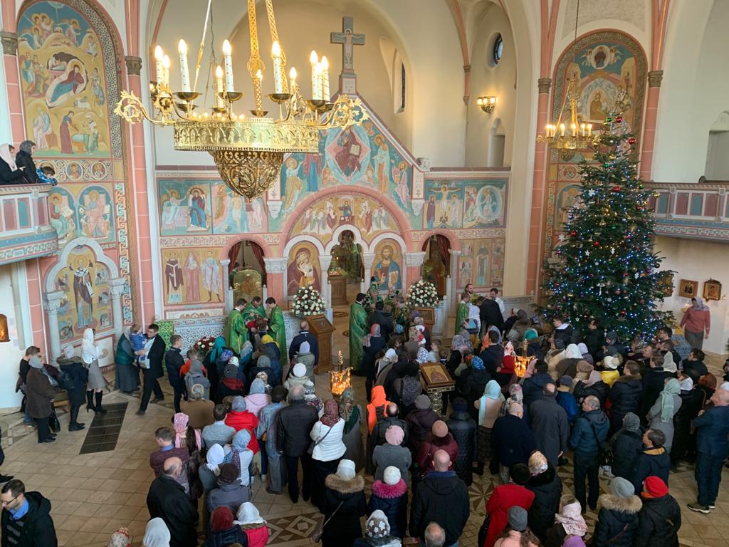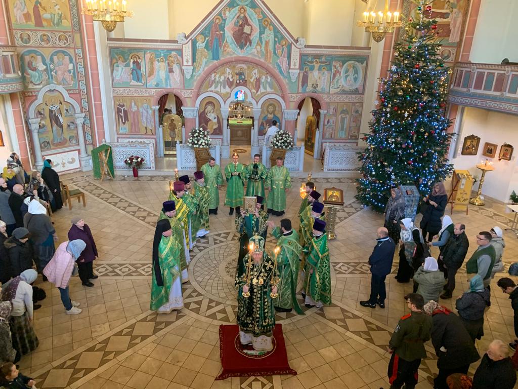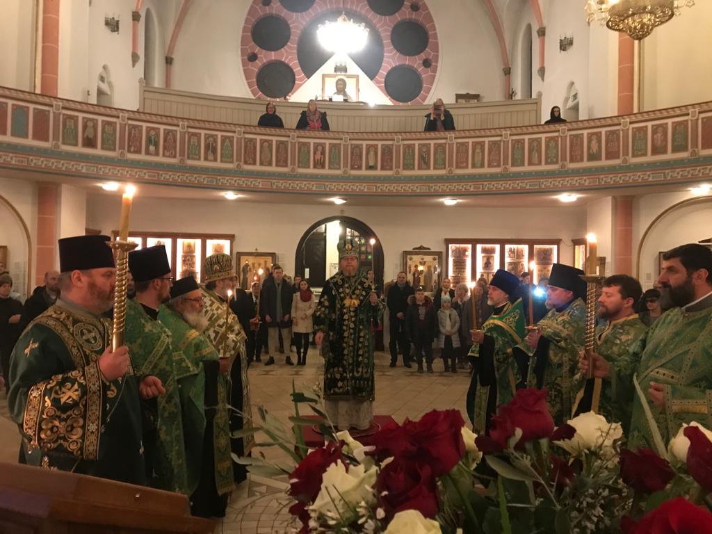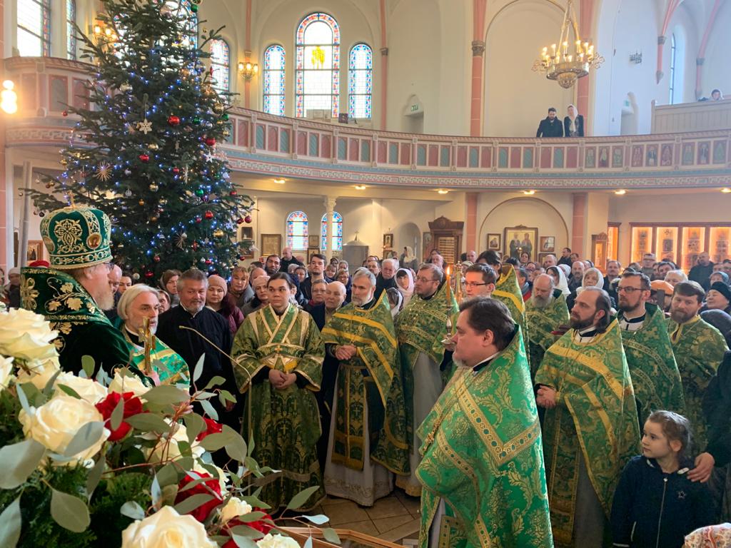 Его Высокопреосвященству сослужили настоятель храма протоиерей Сергий Бабурин, секретарь Епархиального Совета игумен Максим (Шмидт) (г. Ульм), протоиерей Владимир Симонов (г. Киль), протоиерей Геннадий Будько (г. Гифхорн), протоиерей Александр Берташ (г. Бремен), протоиерей Дионисий Идевайн (г. Шверин), иерей Геннадий Сар (г. Гамбург), иерей Иоаким Линдберг (г. Гамбург), иерей Иоанн Сухоняк (г. Гамбург), иерей Димитрий Максимович (г. Тюбинген), протоиерей Давид Квливидзе (Грузинская Православная Церковь), протодиакон Константин Маркович (г. Санкт-Петербург), диакон Арчил Чхиквадзе. В храме молились прихожане и паломники, прибывшие из Берлина, Ганновера, Вены, Копенгагена и других городов.
