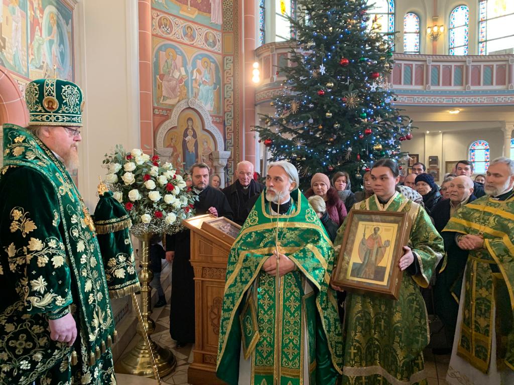 По окончании Литургии было совершено славление перед иконой святого праведного Иоанна Кронштадтского. От лица клира и прихожан архиепископа Тихона приветствовал протоиерей Сергий Бабурин, который преподнес в дар владыке икону святителя Николая, Мир Ликийских Чудотворца.