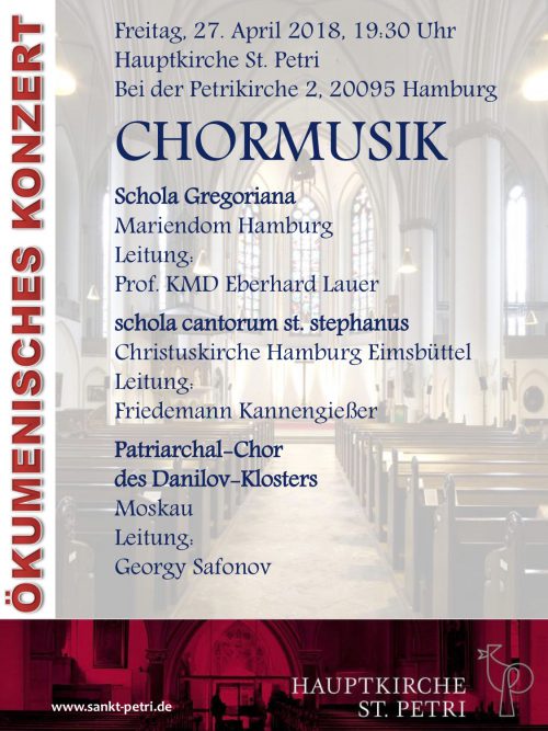 27 Апреля в 19.30 в гамбургском соборе святого Петра (St. Petri Kirche) состоится концерт духовной музыки с участием хоров с немецкой и российской сторон. Организаторы и инициаторы — общественные деятели Клаус Мессершмидт и Томас Гильде.