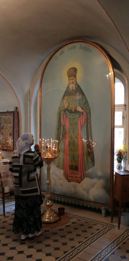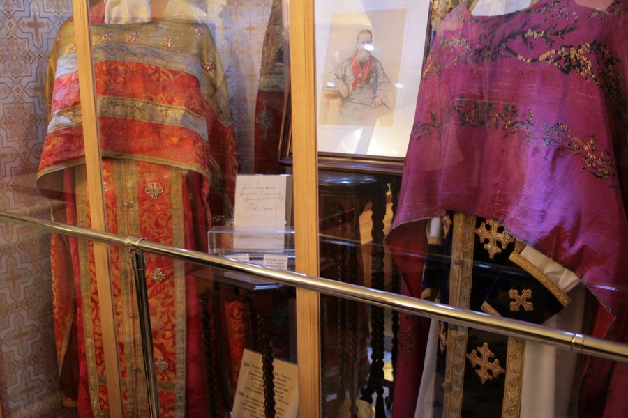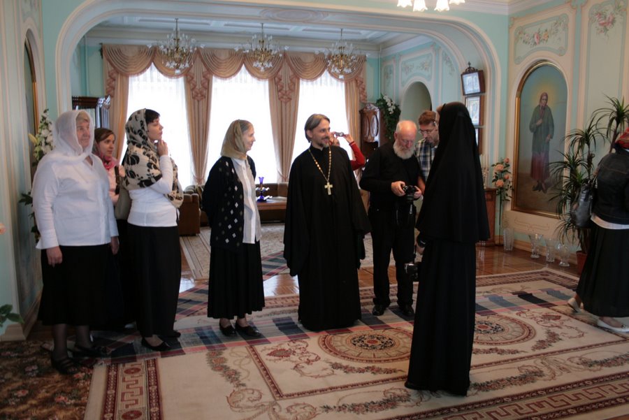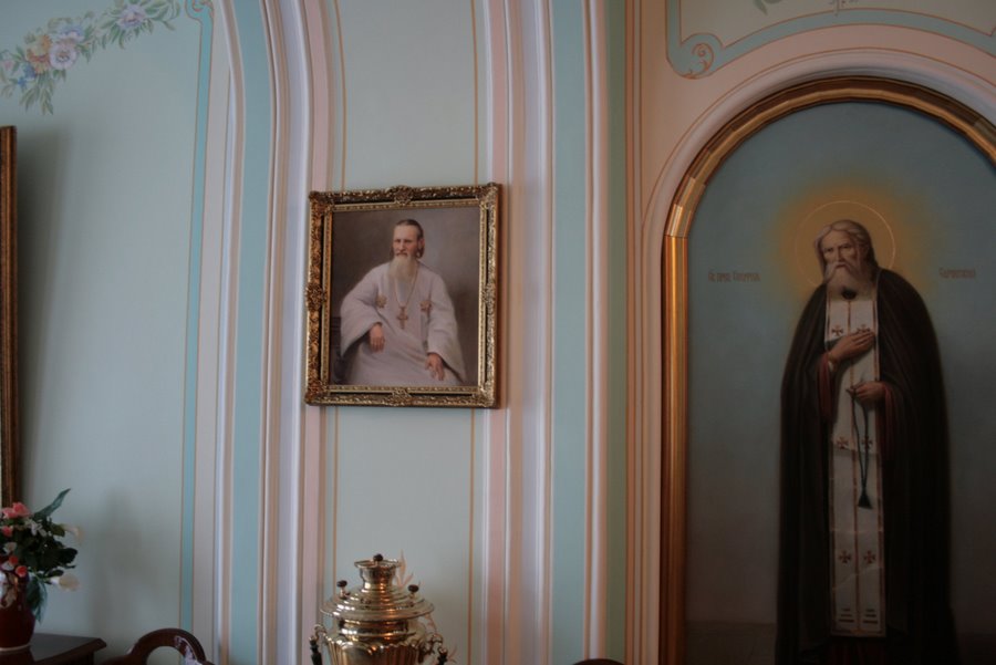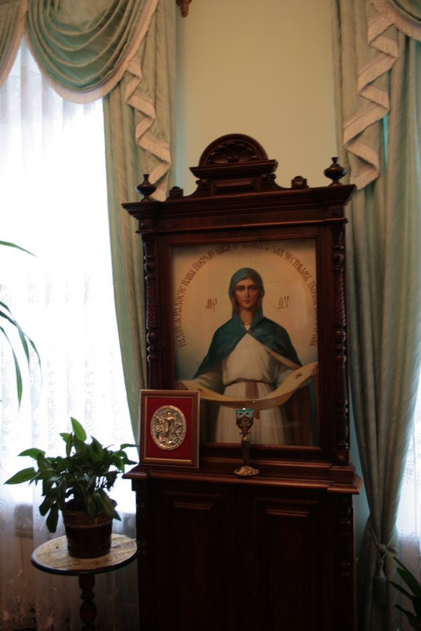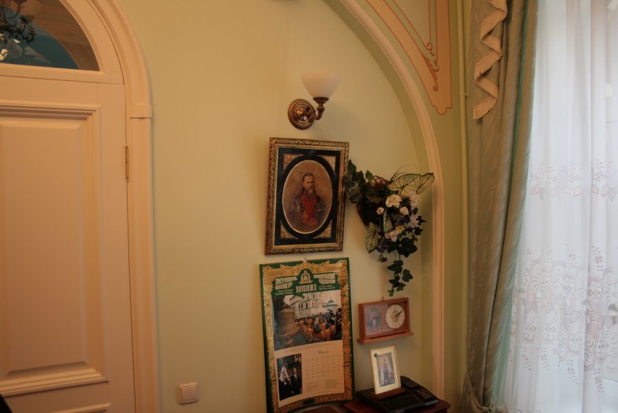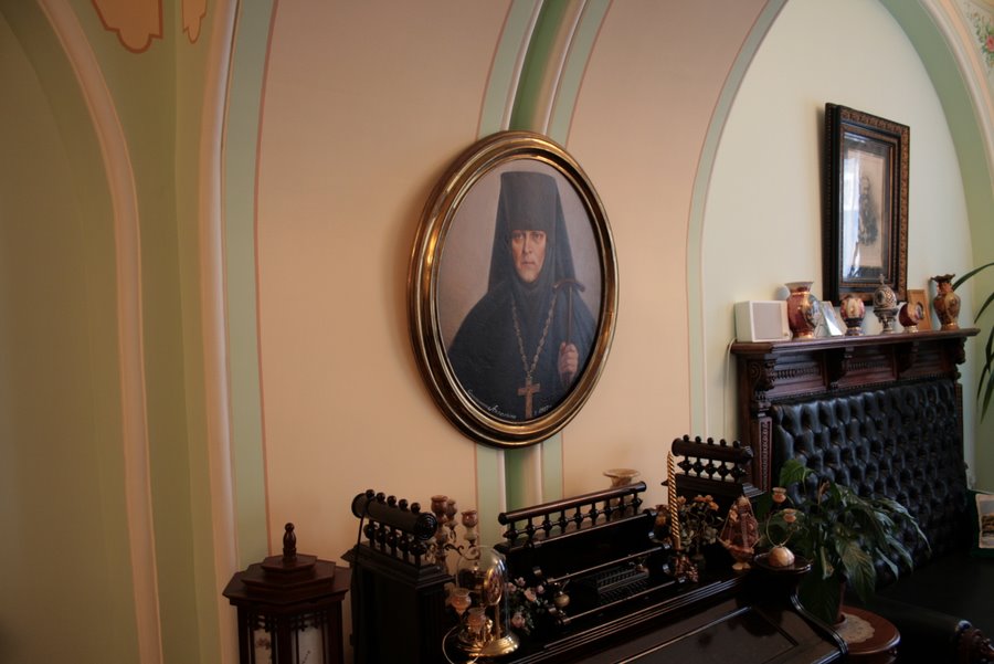 Мы с вами побывали в главном храме обители. С него мы начали рассказ, как исторически первом по значимости. А теперь будем спускаться вниз. После первого лестничного марша нас встречает широкая площадка, от нее ведут две двери, направо и налево. Сюда паломники могут попасть только по особому приглашению — это покои настоятельницы монастыря и исторические покои св. пр. Иоанна Кронштадского, где ныне располагают покои Святейшего Патриарха — ведь монастырь на Карповке ставропигиальный. Сохранилось историческое описание этих покоев, благодаря которому их удалось воссоздать: «В среднем этаже под алтарями помещаются покои о. Иоанна: его моленная комната с угольником, полным икон, с иконами рядом на стенах и с постелью для отдохновения; над постелью Казанская икона Божьей Матери и икона Святителя Николая, искусно вышитая шерстями. Рядом с моленной кабинет с письменным столом; в углу большая икона Спасителя, призывающего всех труждающихся и обремененных; на стене в рамке телеграмма Государя Императора, приглашающая о. Иоанна на крещение Наследника Цесаревича Алексея Николаевича. В этих комнатах о. Иоанн останавливался во время постоянных приездов в столицу. Рядом находился большой зал, украшенный иконами, священными картинами и портретами членов императорской семьи. В этом зале батюшка принимал гостей после богослужений».