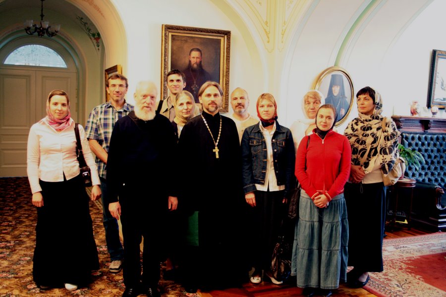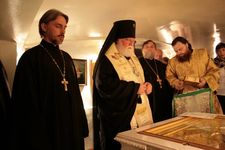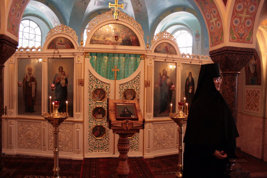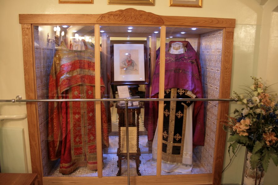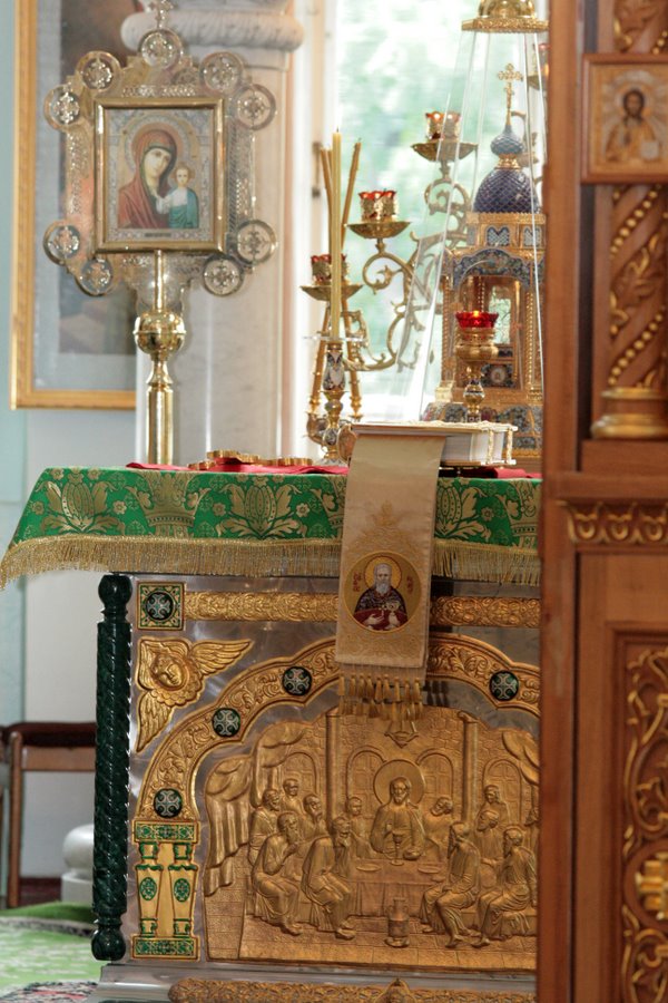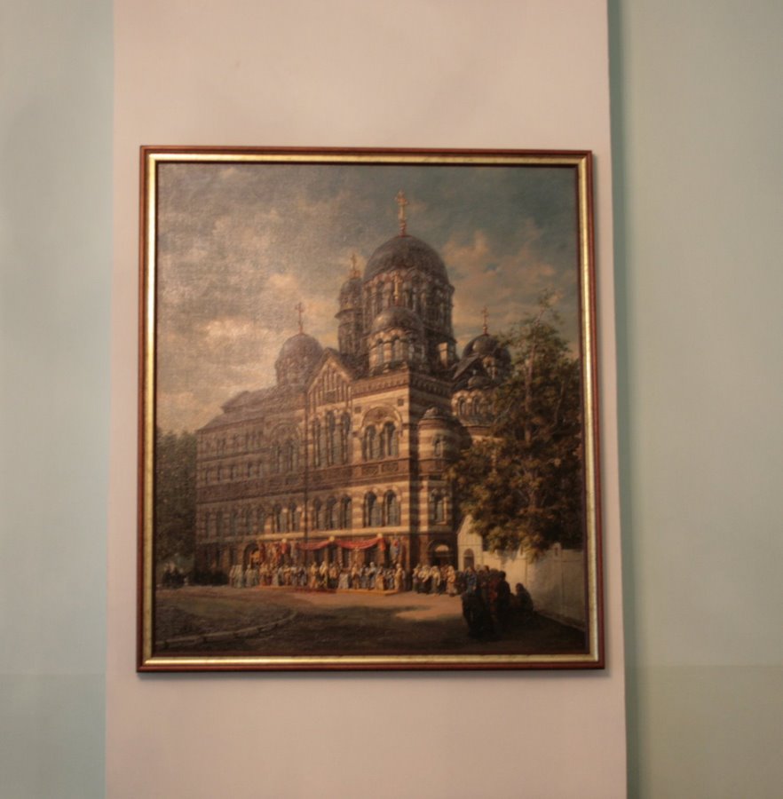 Мы с вами побывали в главном храме обители. С него мы начали рассказ, как исторически первом по значимости. А теперь будем спускаться вниз. После первого лестничного марша нас встречает широкая площадка, от нее ведут две двери, направо и налево. Сюда паломники могут попасть только по особому приглашению — это покои настоятельницы монастыря и исторические покои св. пр. Иоанна Кронштадского, где ныне располагают покои Святейшего Патриарха — ведь монастырь на Карповке ставропигиальный. Сохранилось историческое описание этих покоев, благодаря которому их удалось воссоздать: «В среднем этаже под алтарями помещаются покои о. Иоанна: его моленная комната с угольником, полным икон, с иконами рядом на стенах и с постелью для отдохновения; над постелью Казанская икона Божьей Матери и икона Святителя Николая, искусно вышитая шерстями. Рядом с моленной кабинет с письменным столом; в углу большая икона Спасителя, призывающего всех труждающихся и обремененных; на стене в рамке телеграмма Государя Императора, приглашающая о. Иоанна на крещение Наследника Цесаревича Алексея Николаевича. В этих комнатах о. Иоанн останавливался во время постоянных приездов в столицу. Рядом находился большой зал, украшенный иконами, священными картинами и портретами членов императорской семьи. В этом зале батюшка принимал гостей после богослужений».