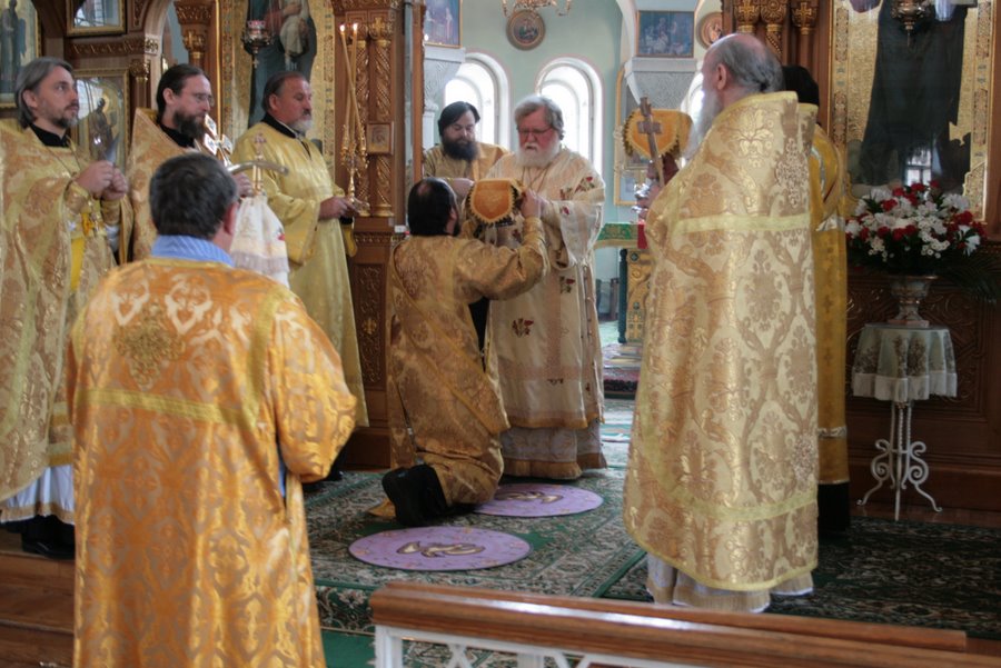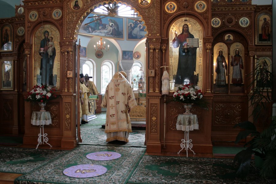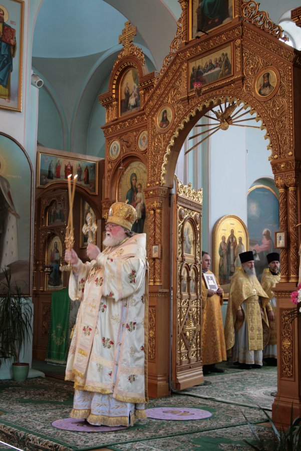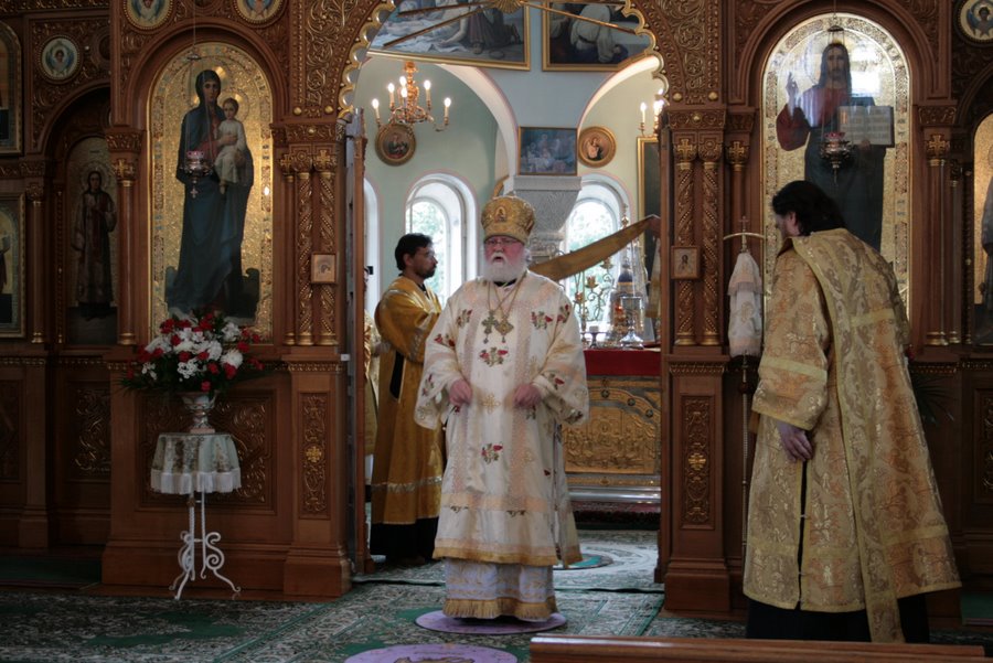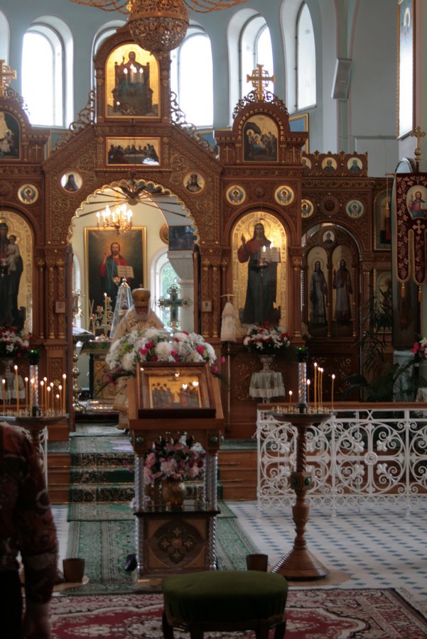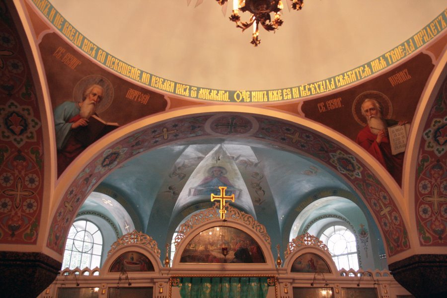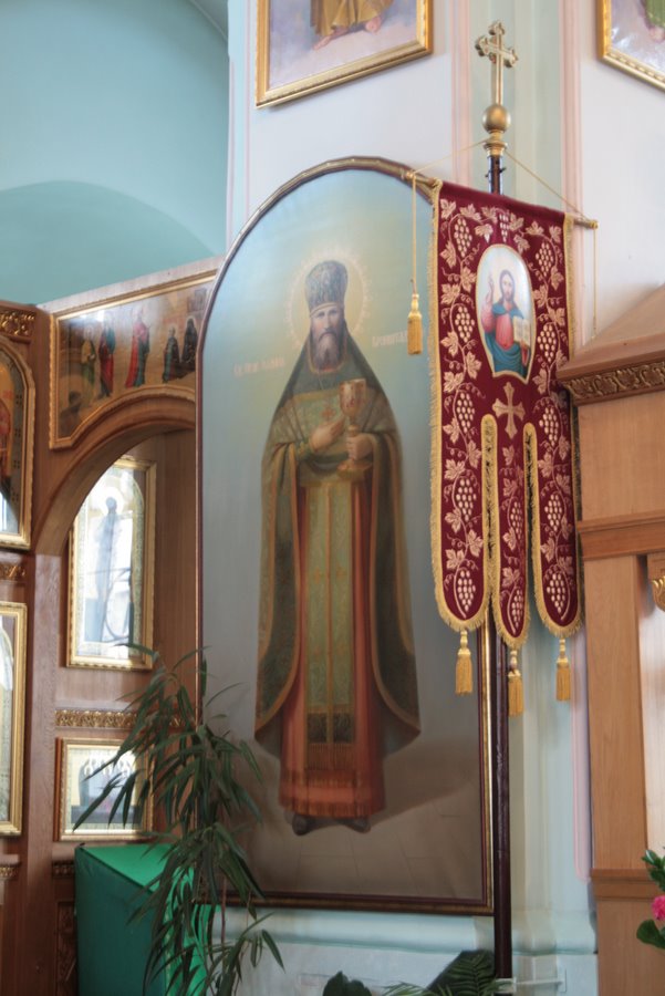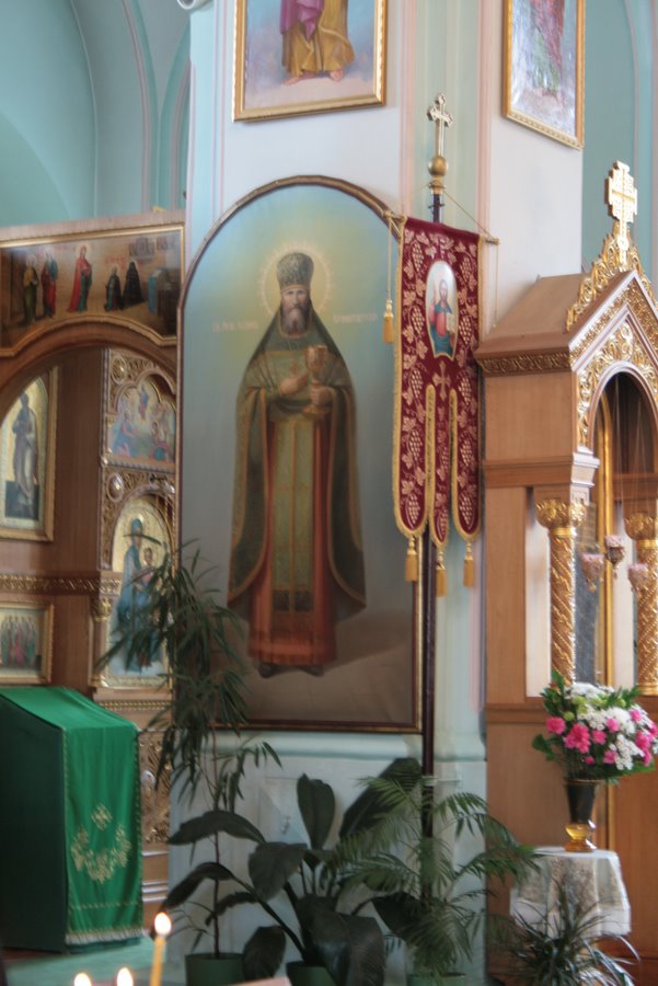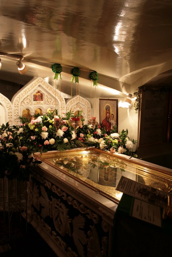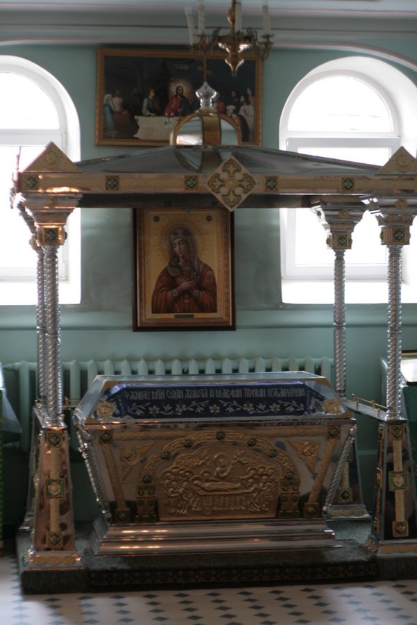 В этом чудном, белом и светлом храме, соответствующем светлой личности дорогого батюшки, он теперь и почивает мирным сном. Стены и пол могилы состоят из сплошных плит белого мрамора. За плитами мрамора сплошной каркас из толстого котельного железа. Стены могилы возвышаются над полом храма на пол-аршина и тоже обложены мрамором. На дно могилы посыпано на два аршина мелкого песку, и на песок поставлен гроб. Гроб не зарыт в землю, а покрыт только массивной мраморной плитой».