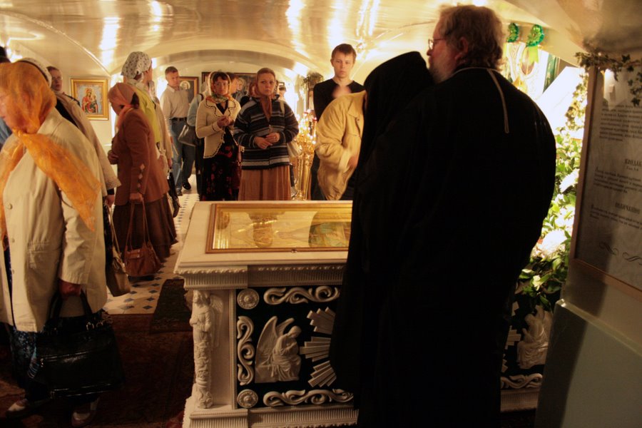 С первого же дня после погребения батюшки к его гробнице началось массовое паломничество. Непрерывно — с раннего утра до позднего вечера — совершались панихиды и молебны у гробницы. Происходили чудные исцеления, только в 1909 году их было зафиксировано 12. До самого закрытия монастыря (и под страхом ареста и после этого) на Карповку стекались паломники со всего света. Батюшку считали святым уже при жизни, а после его кончины люди стали получать различные уверения в том, что он предстоит Престолу Божью вместе с великими святыми угодниками.
