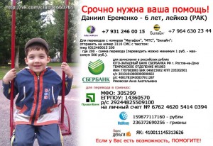 Друзья, так как, к сожалению, в ближайшее время осуществить ТКМ в Москве не представляется возможным, родители решили провести операцию в Немецкой клинике Грайфсвальд. Счет на лечение составит 179 200 евро! http://vk.com/album-31660765_161035517 При оплате депозита в 70 000 евро Данечку ждут на лечение уже 10 сентября. Срочный сбор! Срок?… Срок — как можно скорее! Нам надо очень постараться, чтоб не было слишком поздно. Время против нас, но мы должны его опередить