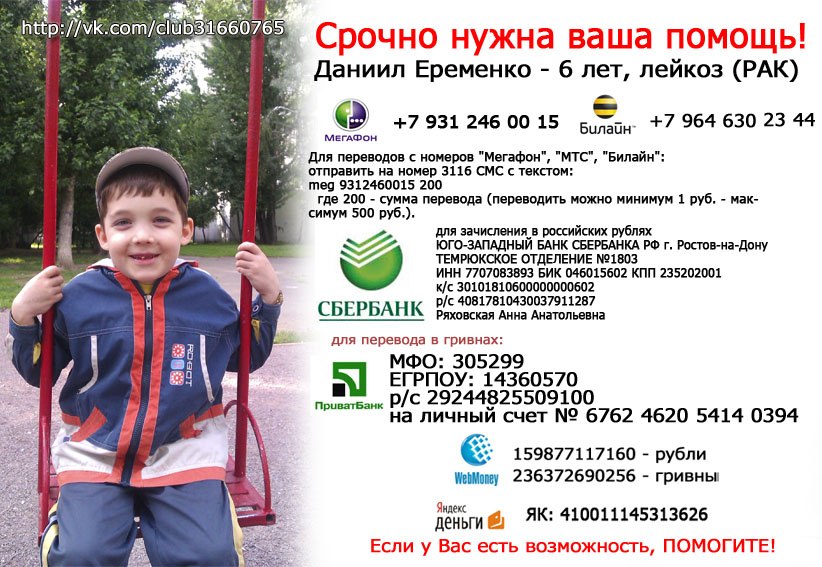Группа помощи Даниилу Еременко (6 лет) лейкоз. ЦЕНА ЖИЗНИ 179 200 евро!