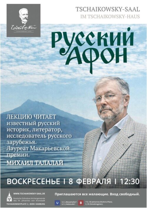 Приглашаем вас на встречу с известным историком, литератором и исследователем русского зарубежья Михаилом Григорьевичем Талалаем. Тема встречи — «Русский Афон».