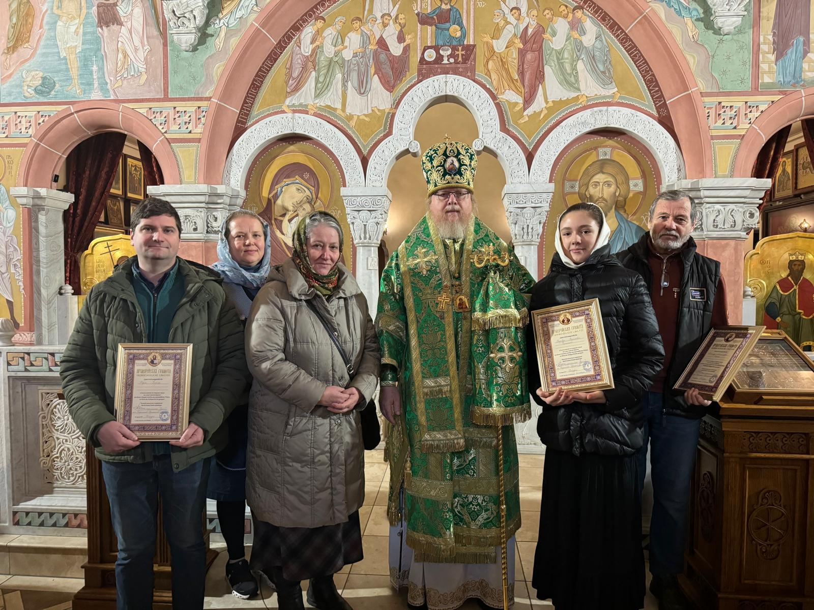 Затем архиепископ Тихон вручил особо потрудившимся прихожанам архиерейские грамоты.