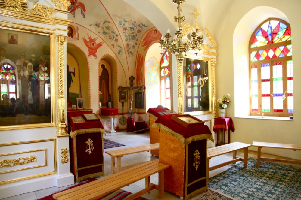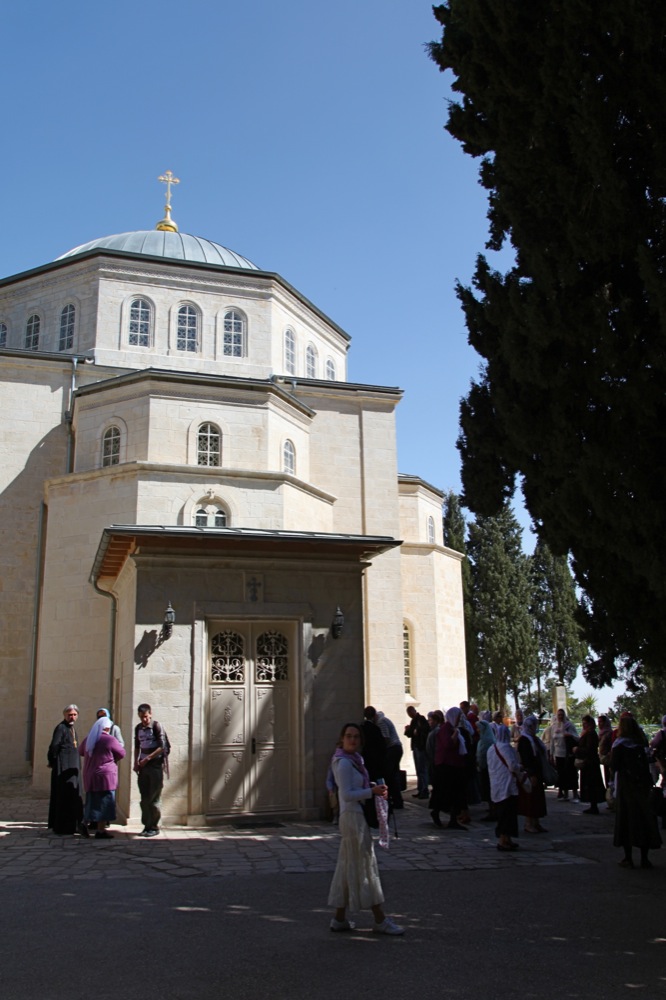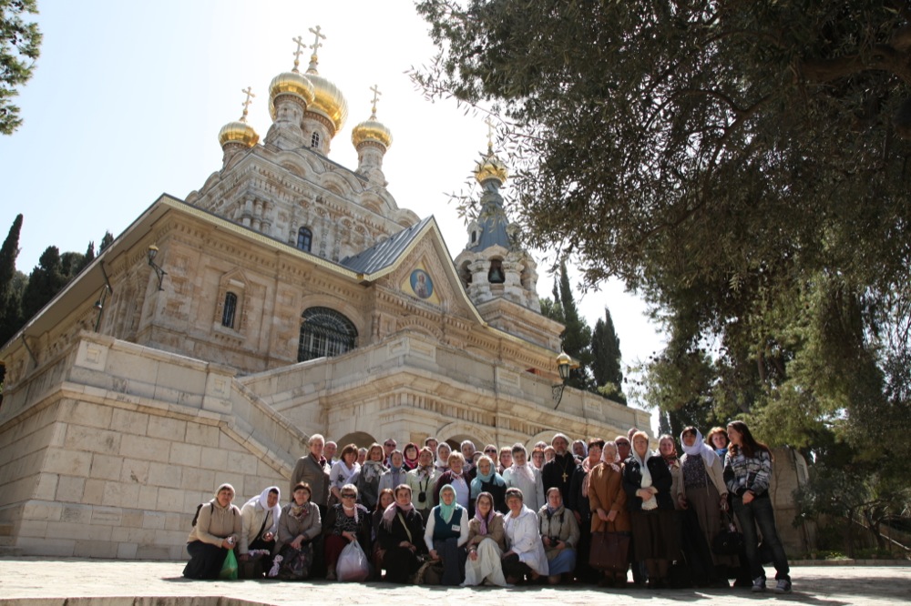Утро следующего дня на Святой Земле началось для нас с Божественной литургии в церкви, освященной в 1888 г. в честь святой равноапостольной Марии Магдалины и расположенной у самого подножия Елеонской горы в Иерусалиме. На торжество освещения храма, построенного царем Александром III в память своей матери, царицы Марии Александровны, присутствовали брат царя — председатель Палестинского общества, Великий Князь Сергей Александрович с супругой, Великой Княгиней Елизаветой Федоровной. В алтаре храма находится уникальная Чаша, подаренная Елизаветой Федоровной в честь освящения храма, с прекрасными эмалями, изображающими крестные страдания Спасителя. В 1921 г. этот храм и стал местом упокоения преподобномученниц Великой Княгини Елизаветы Федоровны и ее келейницы инокини Варвары. В 1933 г. здесь образовалась женская монашеская община. В Гефсиманский монастырь сестры пришли из Вифании. В тридцатые же годы в монастыре появилась чудотворная икона Божией Матери Одигитрия. Почти черная икона самообновилась и стала мироточить.