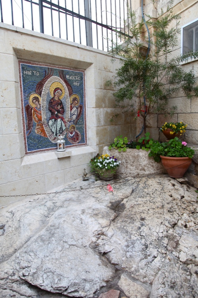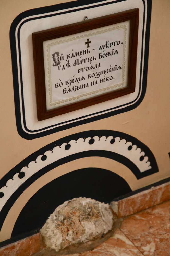 Справа при входе в храм можно увидеть камень, на котором по преданию стояла Пресвятая Дева Мария при вознесении Спасителя.