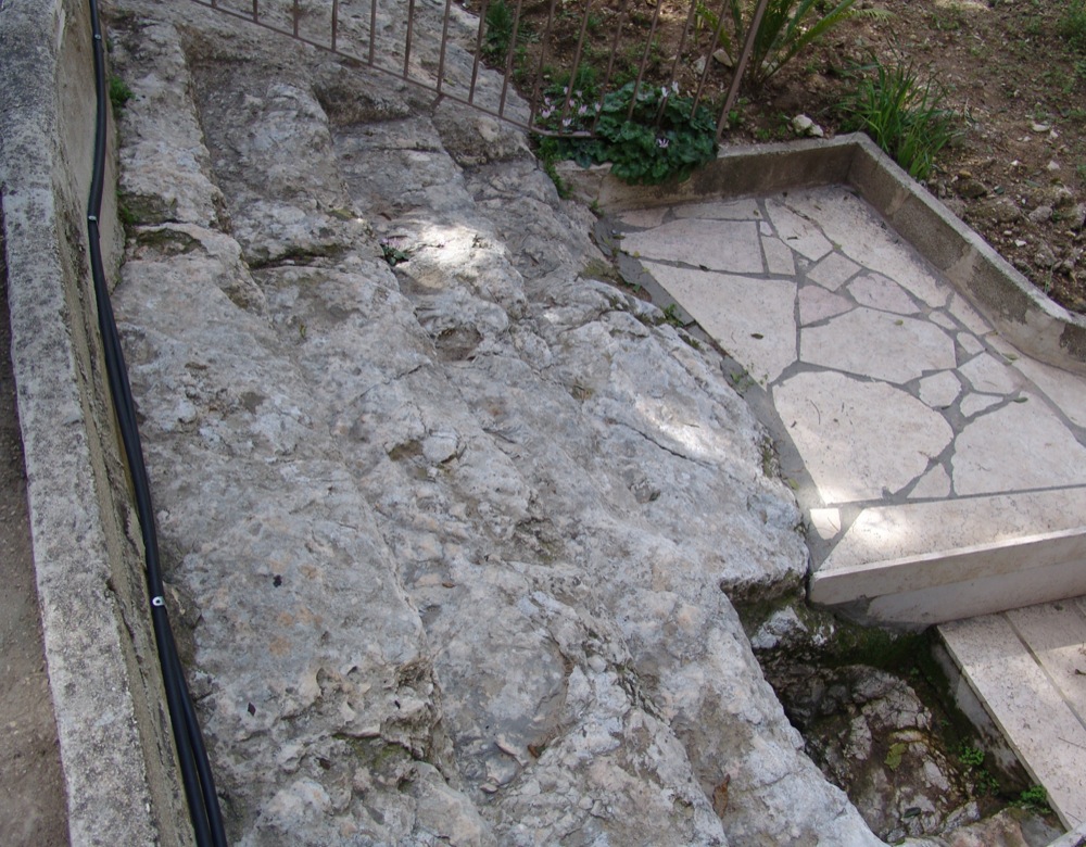При входе в монастырь слева находятся последние из немногих оставшихся ступеней древней библейской лестницы, ведшей две тысячи лет с Елеона в Иерусалим. По этой лестнице и совершился вход Господень в Иерусалим.