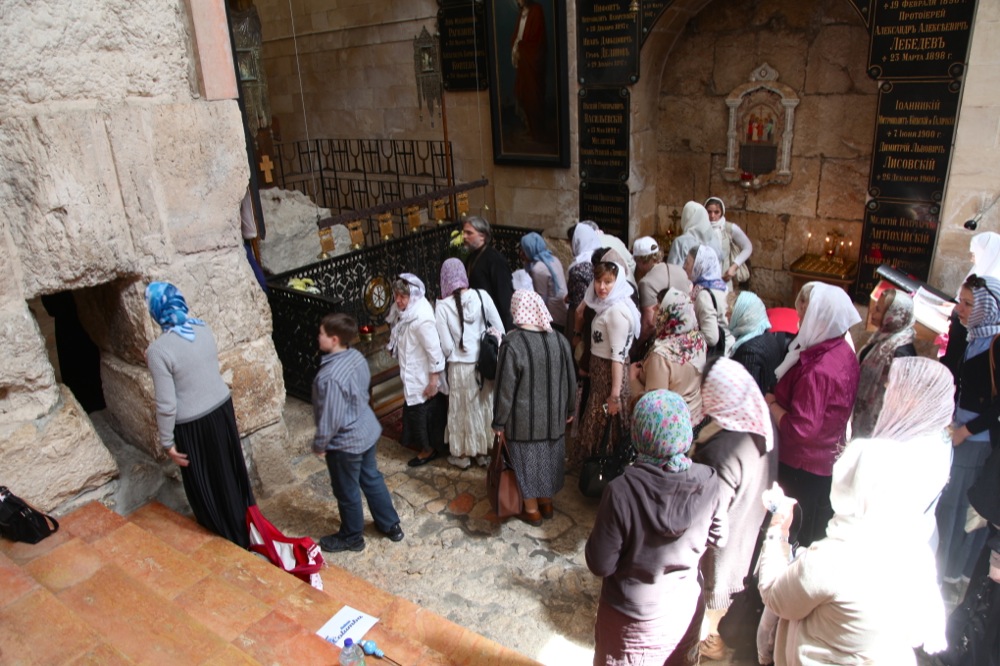 Побывав в пещерах, расположенных глубоко под землей, но при этом в нескольких метрах от Храма Воскресения Господня, мы направились на вершину Елеонской горы, место, с которого вознесся на небо Иисус Христос на сороковой день после Своего Воскресения. В сотне метрах от места вознесения находится русский Свято-Вознесенский монастырь. В Вознесенском храме и был погребен архимандрит Антонин (Капустин) после своей смерти в 1894 г. Мы помолись о упокоении души неутомимого труженика, строителя и исследоваля святынь Палестины. Вся Русская Палестина — плод жизни этот святого человека.