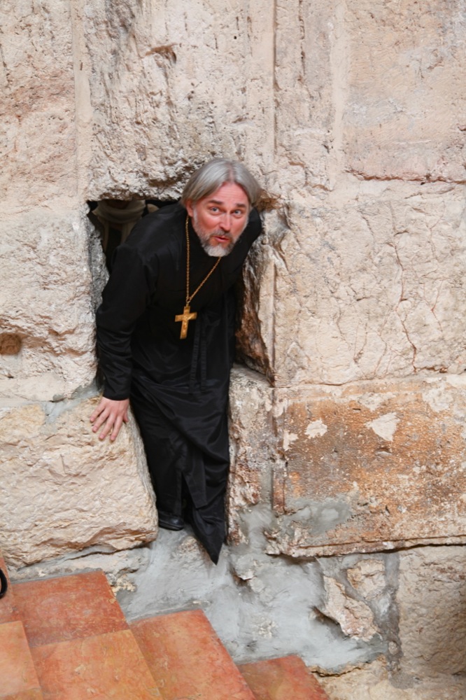 Слева от этого камня расположена стена с небольшим отверстием. Это древний вход в город, остававшийся открытым после затворения Городских ворот в ночное время. Это и есть то самое «игольное ушко», сквозь которое верблюду легче пролезть, чем богатому войти в Царство Небесное. Всем участникам нашей паломнической поездки оказалось под силу, хоть некоторым и не без труда, пролезть сквозь «игольное ушко».
