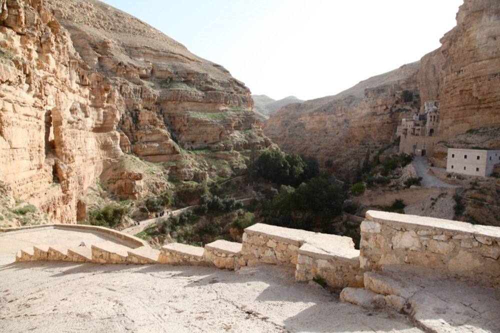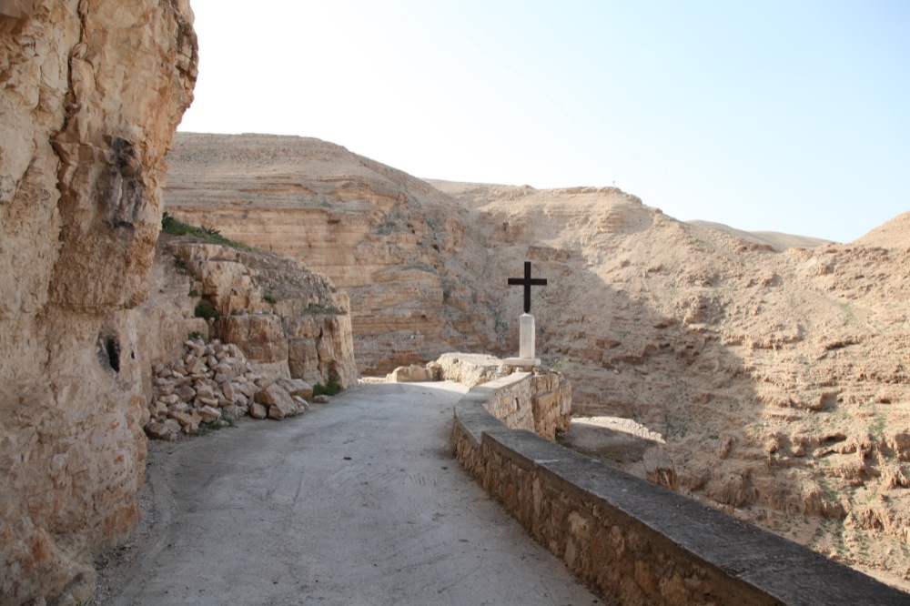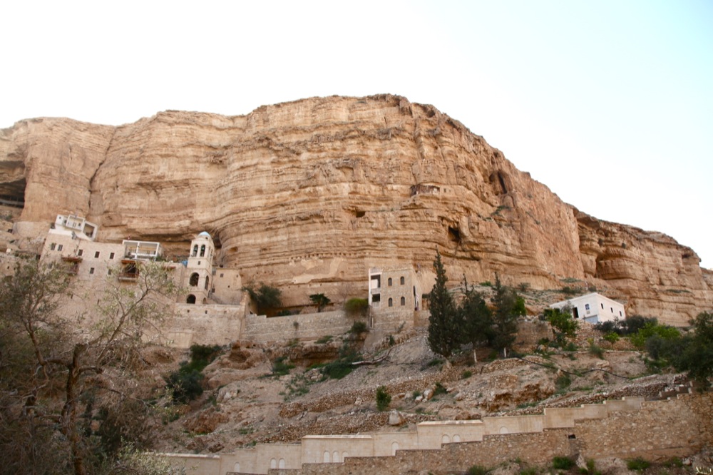 Спустившись с Елеонской горы, автобус помчал нас в Иудейскую пустыню, навстречу одному из самых живописных монастырей Палестины, монастырю св. Георгия Хозевита. Основанный в V в. и кажущийся прилепленным к скале, монастырь не имеет дорог, по которым мог бы проехать автобус. Поэтому часть пути мы прошли пешком, любуясь видами ущелья и разбросанными по нему пещеркам-кельям, в которых возможно и в наше время монахи-отшельники совершают свой подвиг. По преданию, в этом месте праведный Иоаким оплакивал свою бездетность, а в одной из пещер скрывался пророк Илия, принимая пищу от ворона. В монастыре находятся нетленные мощи св. Иоанна Румына, подвизавшегося в монастыре в середине ХХ века.