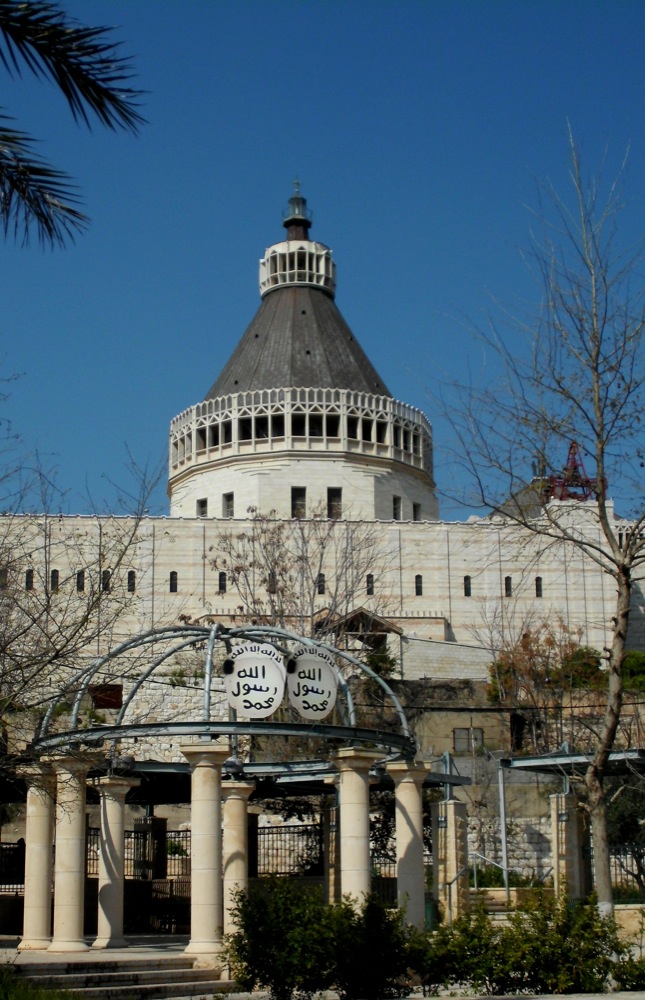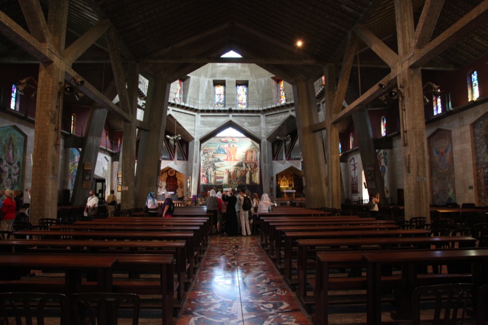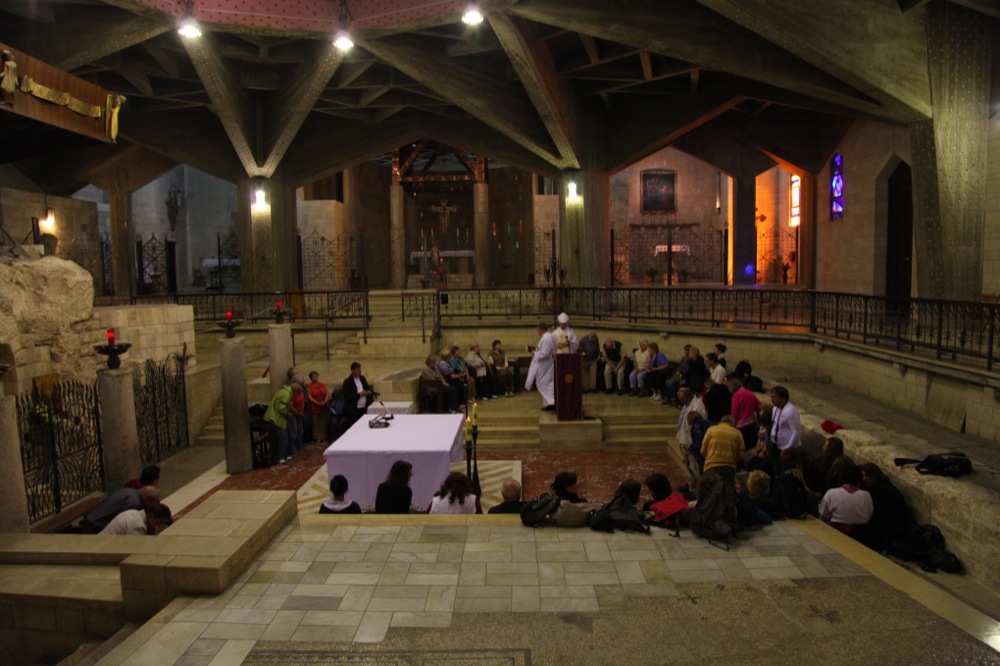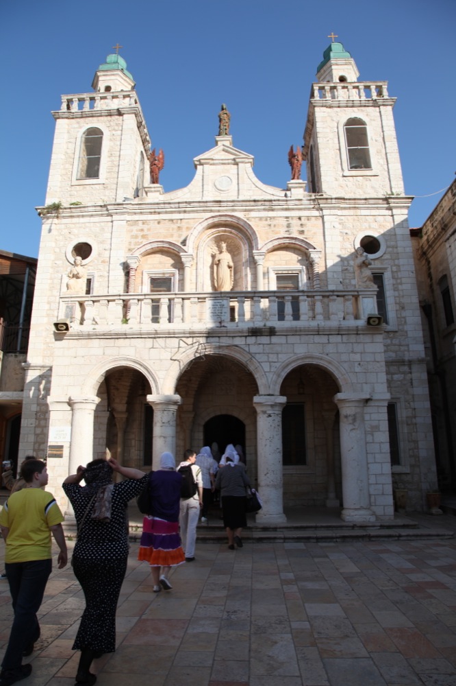 Следующий пункт нашего назначения — место, где произошло Благовещение и в котором Иисус Христос провел большую часть своей земной жизни до выхода на проповедь в 30 лет — Назарет, был уже виден с горы Фавор. Автобус высадил нас недалеко от величественной католической базилики Благовещения, рядом с которой находятся раскопки Назарета евангельского и ранневизантийского времени. Базилика расположена на месте, где находилось жилище святого семейства. На нижнем уровне храма находится Грот Благовещения. По преданию здесь жила Дева Мария, когда сам Архангел Гавриил сообщил ей Благую Весть. Мы оказались в храме в тот день, когда западная церковь вспоминает Благовещение. Храм утопал в цветах и в разных местах совершались латинские мессы.