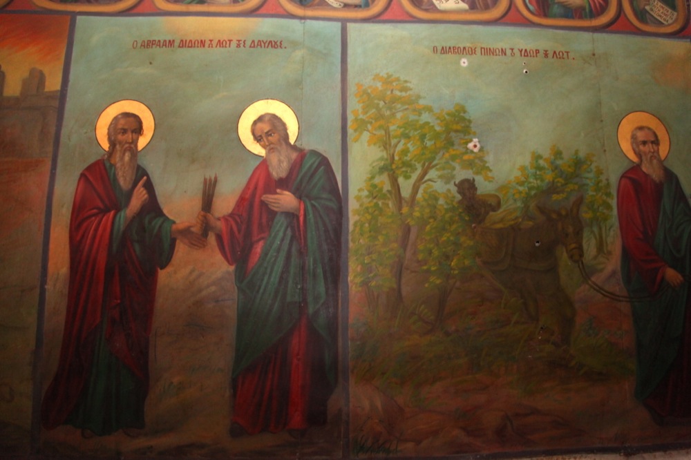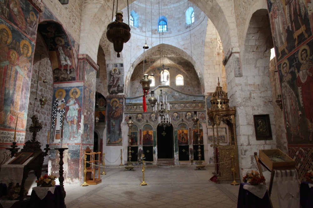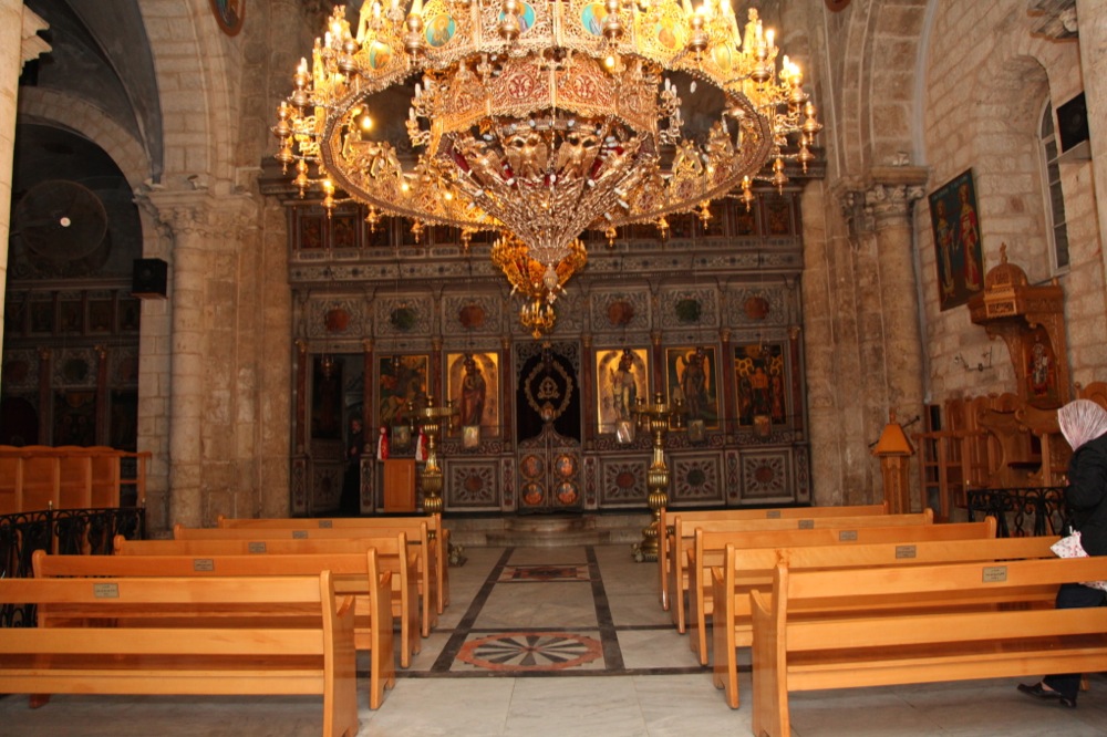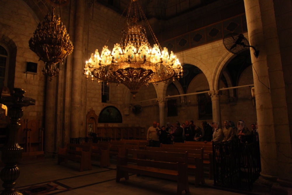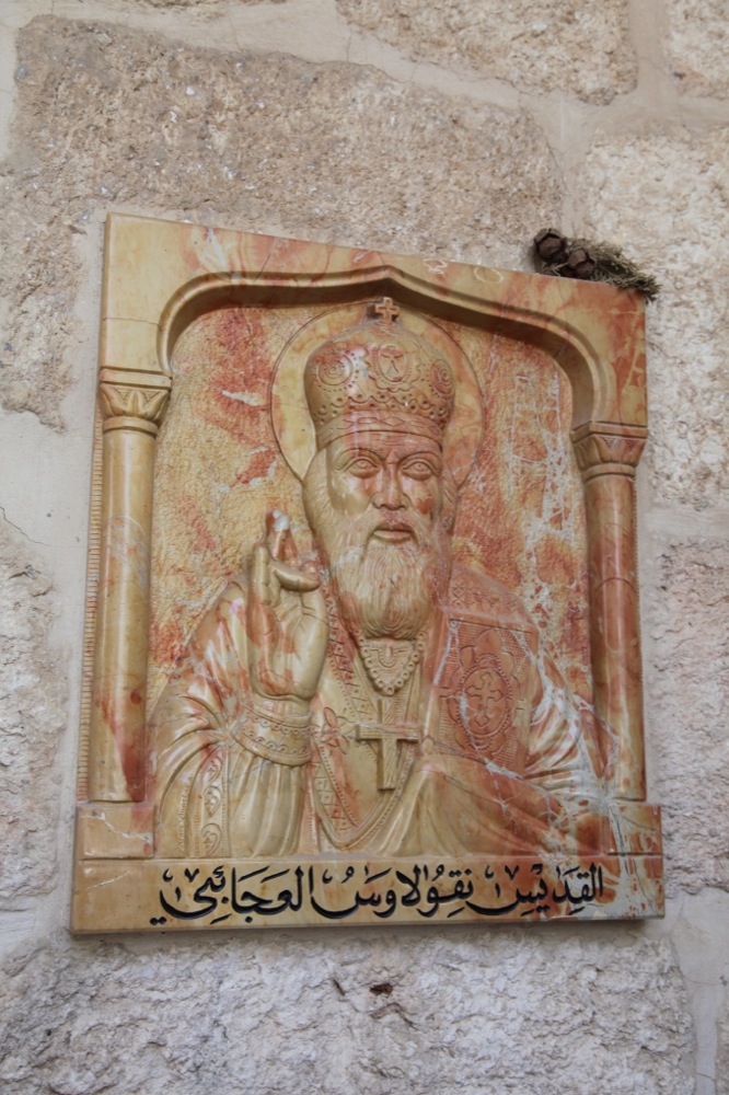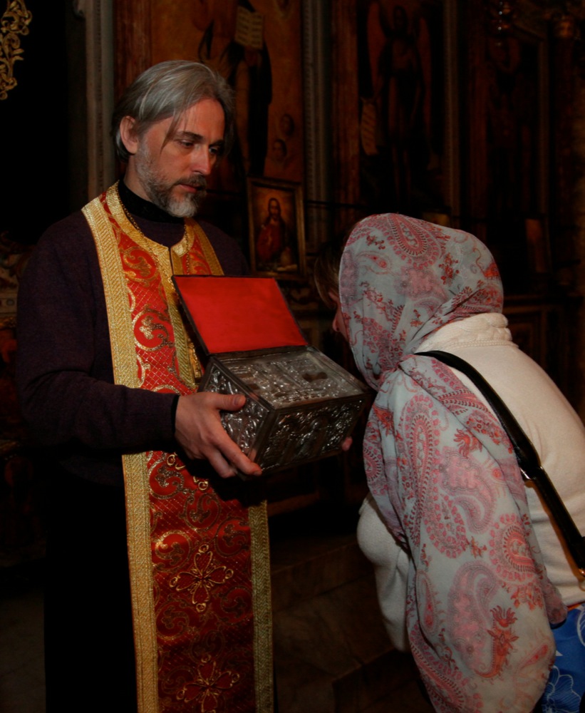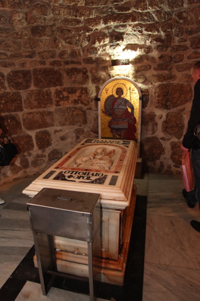 И напоследок мы заехали в город Лидда (современное его название — Лод), в храм св. Георгия Победоносца, где он по преданию был погребен после своей мученической кончины. В храме находятся вериги, в которые святой был закован в последние дни своей земной жизни. Крипта храма указывает на предполагаемое место погребения св. Георгия. Мощей не сохранилось, но нам вынесли для поклонения ковчежек с частицами мощей великомученика. Еще одной святыней этого храма является Лиддская икона Божией Матери, чудесным образом явленная на одной из колонн храма.